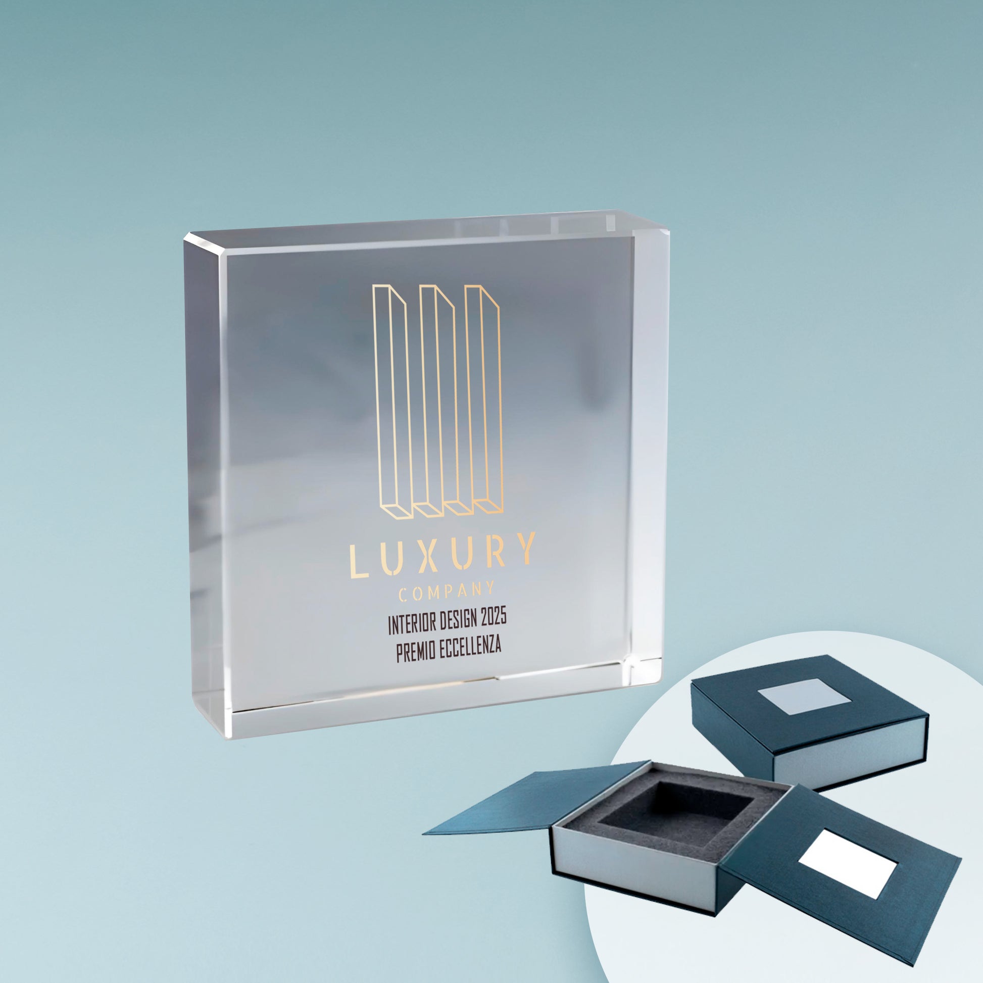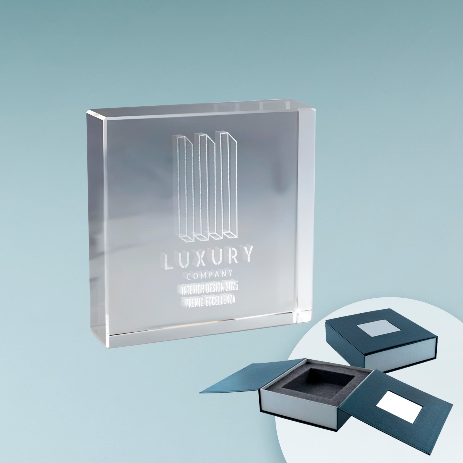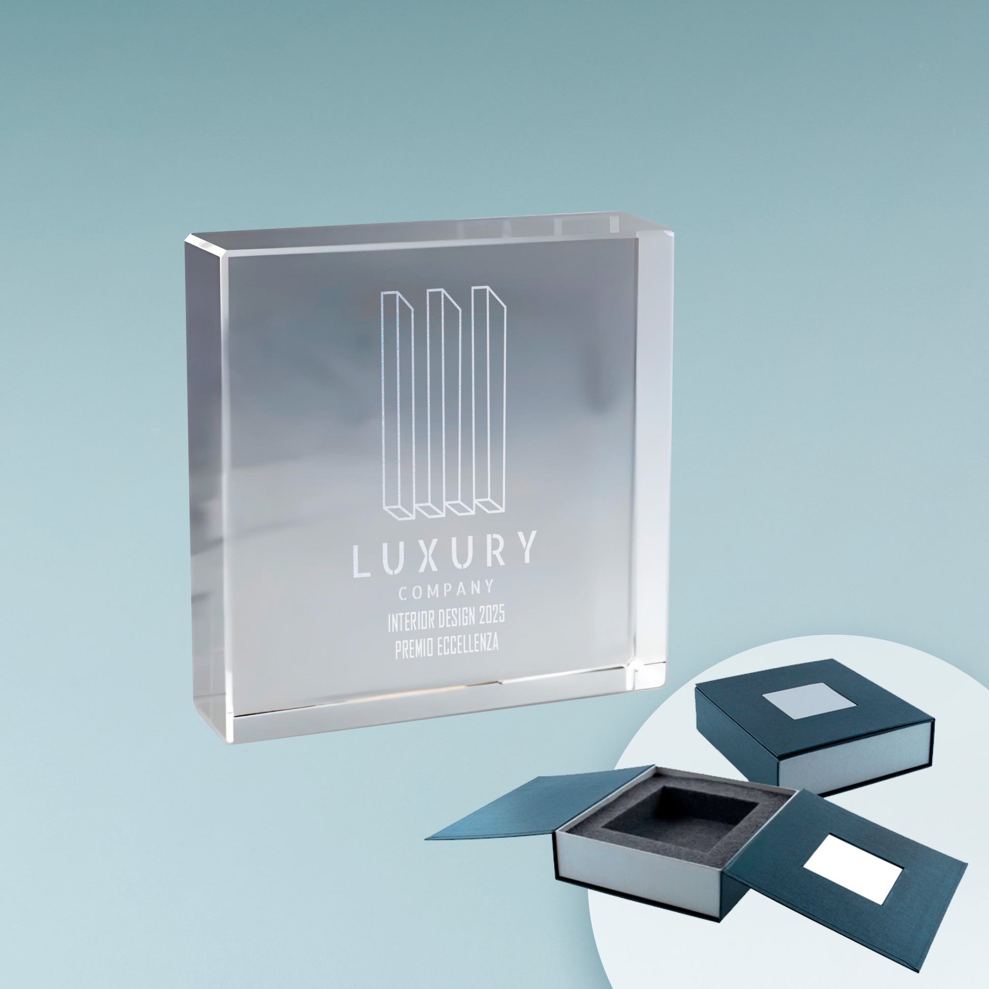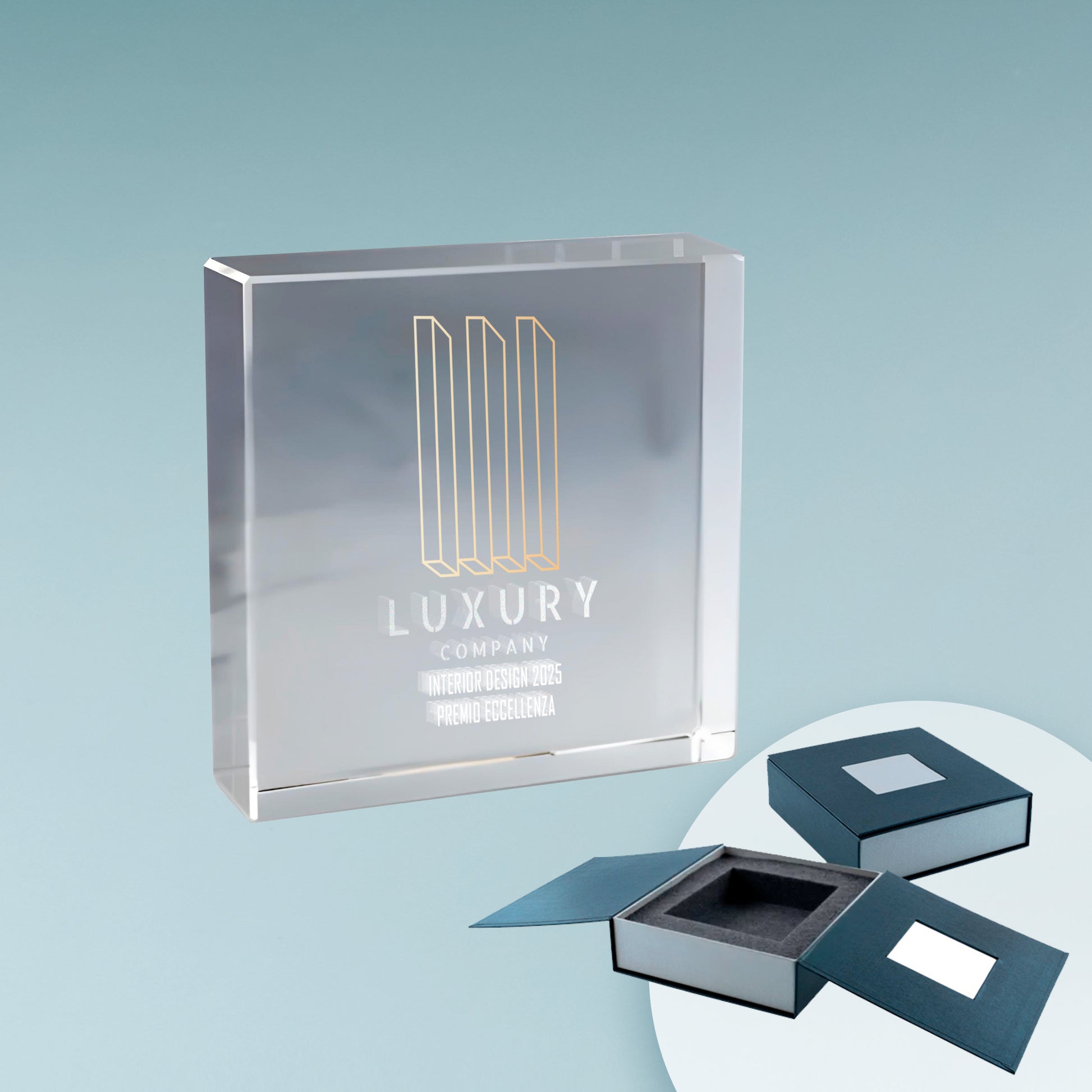 Vetro ottico (Optical Glass): elegante e di altissima qualità, può essere inciso in 3D all’interno, in superficie o marcato con stampa a colori UV per dettagli sorprendenti.