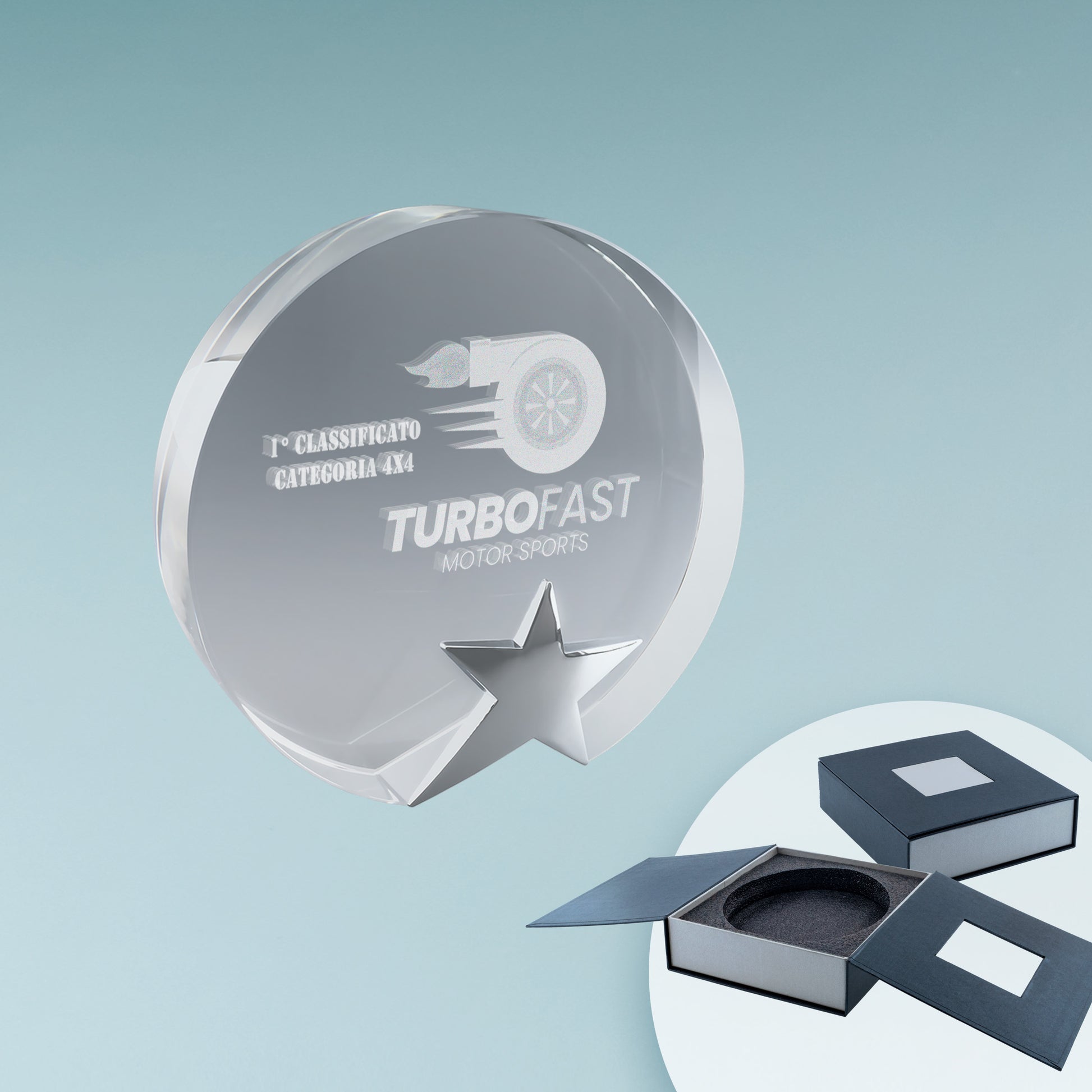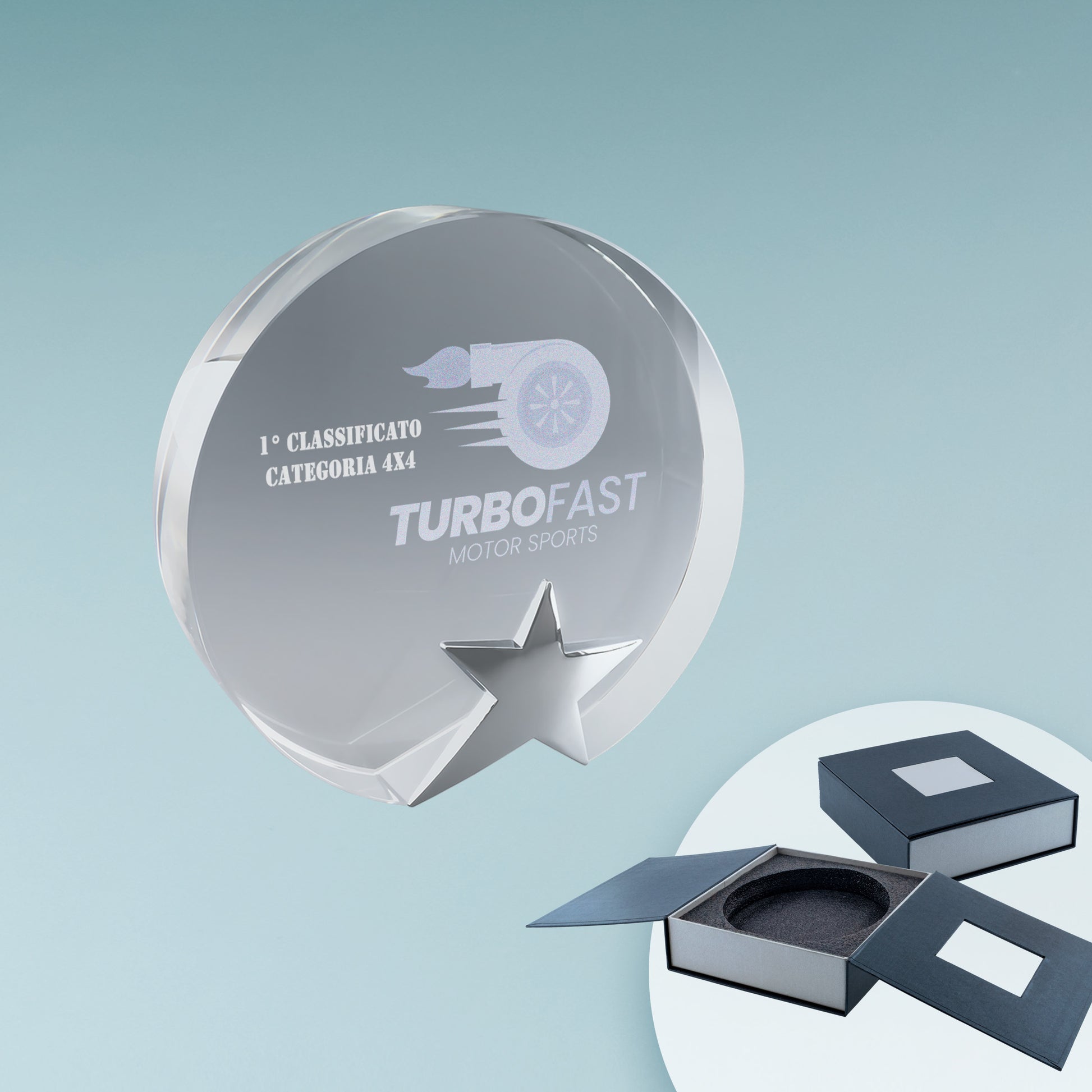 Vetro ottico (Optical Glass): elegante e di altissima qualità, può essere inciso in 3D all’interno, in superficie o marcato con stampa a colori UV per dettagli sorprendenti.